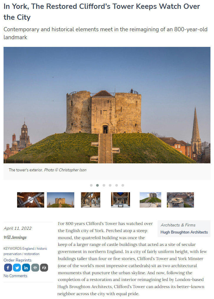 A review of the Hugh Broughton Architects’ work at Clifford’s Tower, York, which involved conservation of the 800 year old building, and the subtle insertion of a new public access structure.