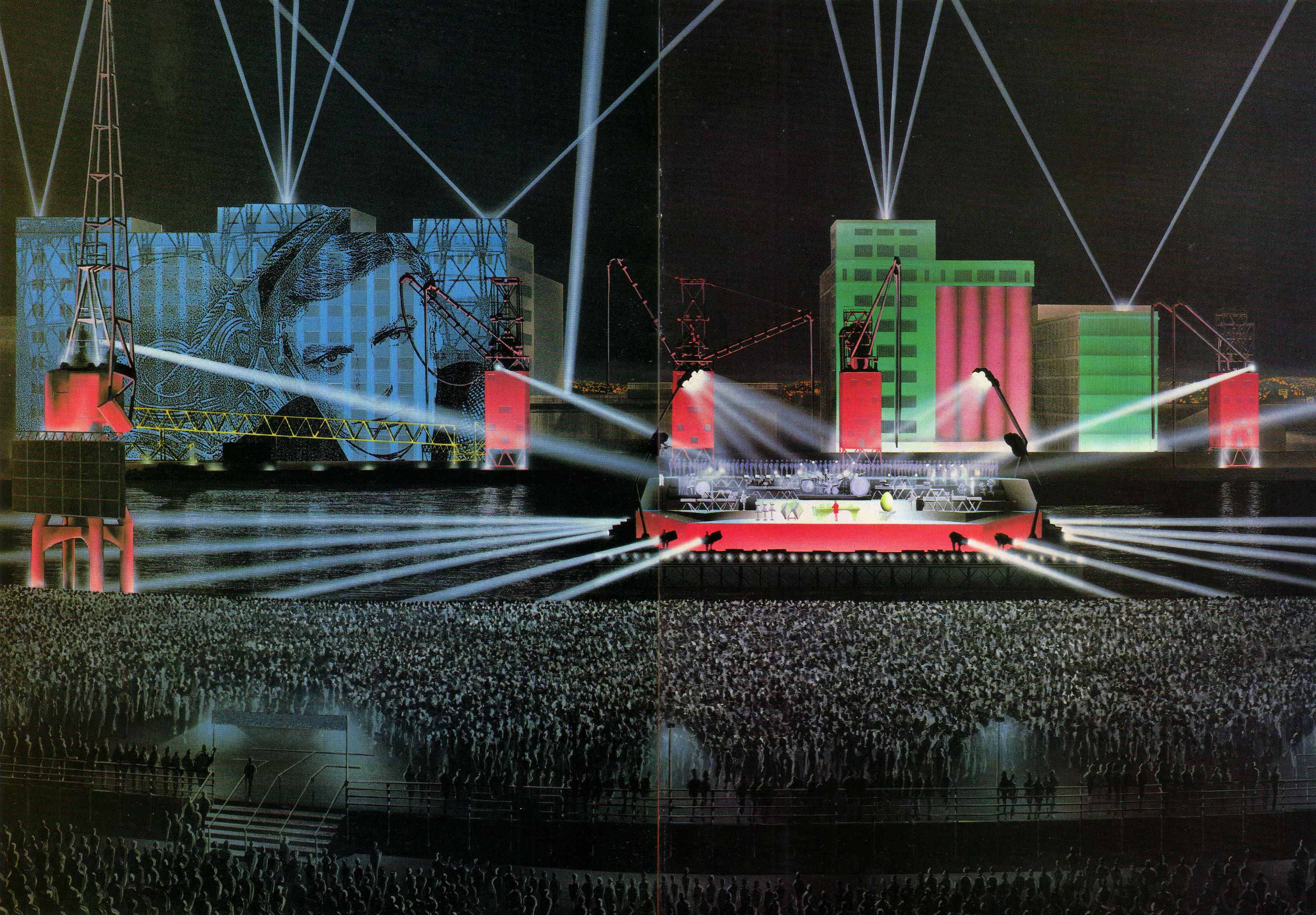 As with the transformation of Houston, Jarre partnered with British architect Mark Fisher to turn buildings into scenography. Also a baby-boomer, Fisher had trained at the Architectural Association during their mid-Sixties exploration of radical new ideas for architecture and society: pop-up, portable, inflatable, walking, DIY, ephemeral, and cybernetic. From 1969 Fisher studied for his diploma under Peter Cook as the Archigram founder pushed the architectural agenda towards pleasure, questioning rules of the elite and pulling inspiration from popular consumerism as much as classical tradition. Jarre partnered with him for his architectural extravaganzas after Fisher had already designed The Wall for Pink Floyd and taken his utopian trainings firmly down the path of spectacle and sensation.
