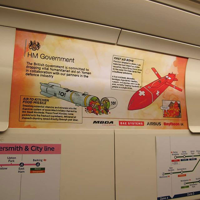 Their recent collaboration with artist Darren Cullen saw Underground trains decorated with a satirical property advert for a fictional luxury development “Bellend Palace” which arguably offered more scope for a commuting Londoner to identify with more than the patronising HSBC effort. Another parodied BAE Systems, Airbus and the British Governments work in Yemen, another was for Jesus Christ’s new van hire company, and then one highlighting mobile phone tracking.