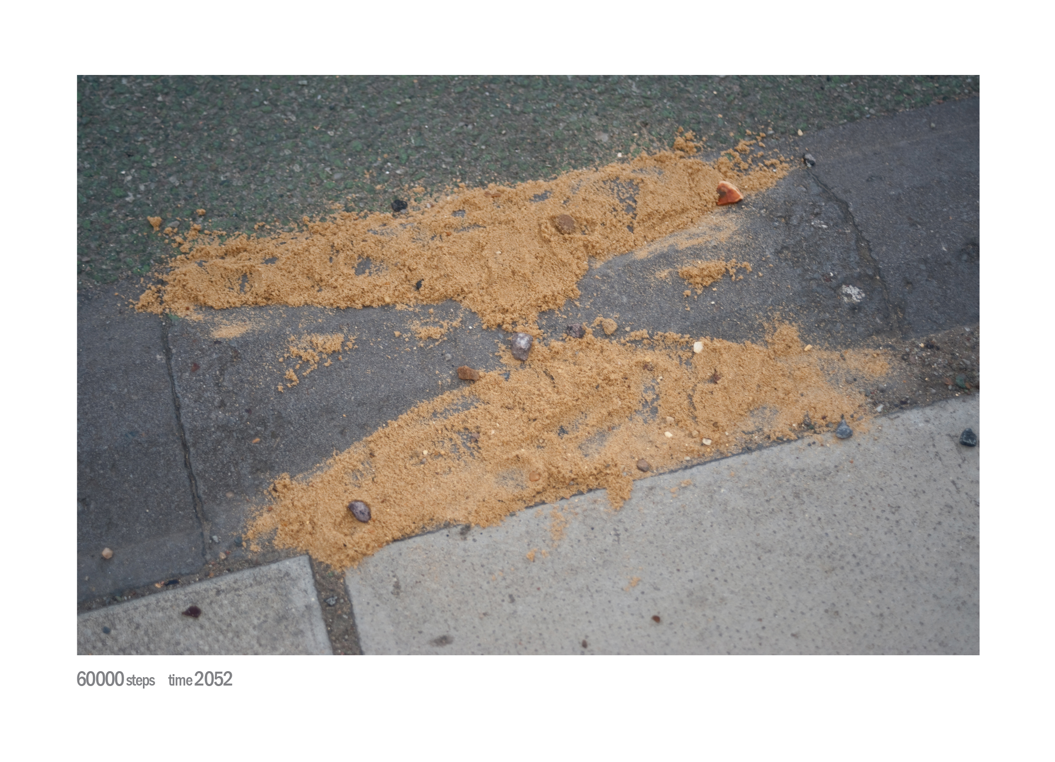 The sand at each mile was set as a small, site-specific, installation. Because the exact location, territory and materiality of each milepoint was unknown until the two thousandth step was taken there is a chance quality and celebration of the everyday, mundane and ‘dull’ landscape detail rather than the composed, gestural study. The small site-specific milesands are sculpted interjections concerning landscape on a minute scale. Also at play is the immediate artistic response to locale the artist faces, an intuitive mark making exercise as instinctive reaction, where sand is the material and the urban site the canvas.