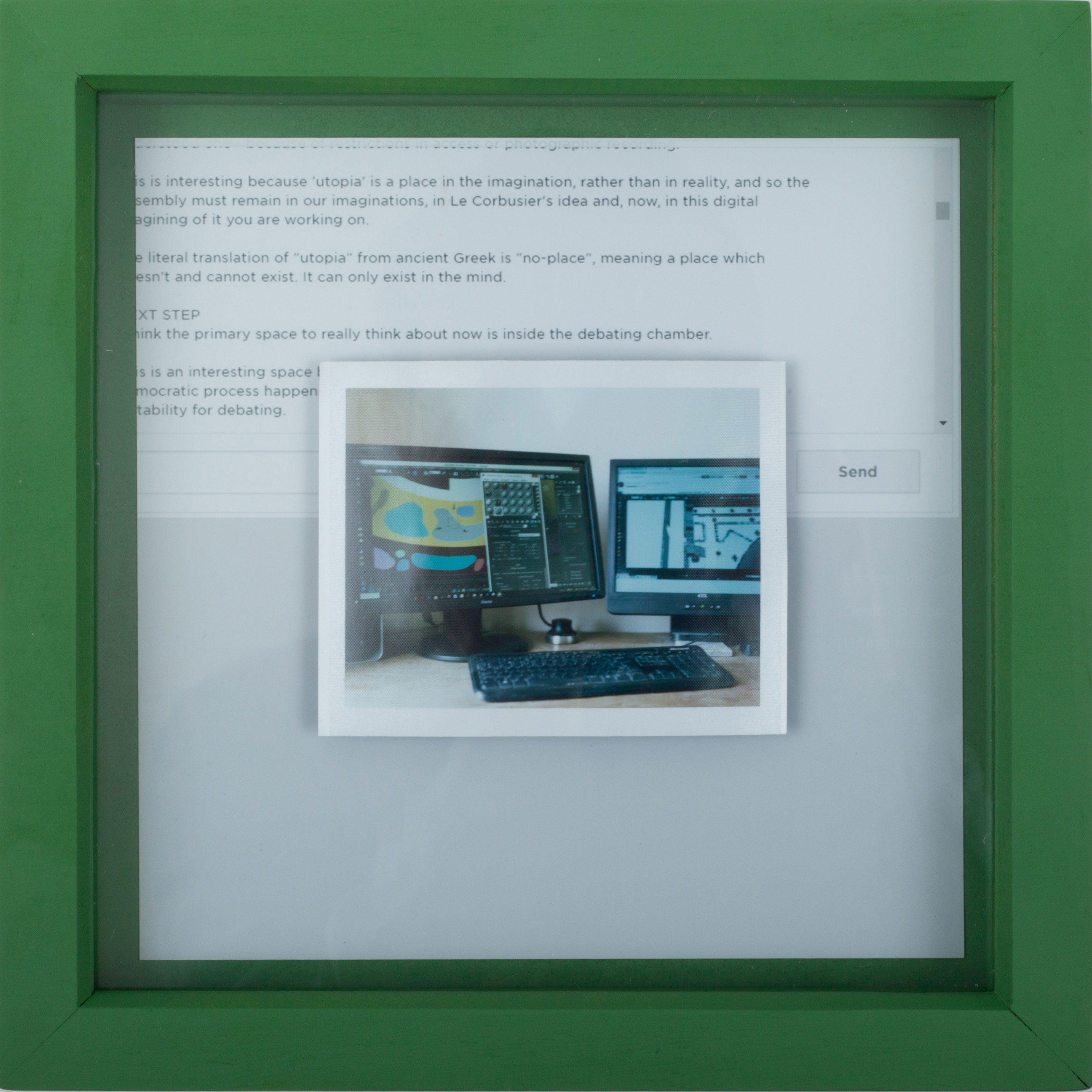 The installation consisted of a looping CGI walkthrough, printed extracts of the communication between Will and Nivik, analogue ‘mis-photographed’ images of the screens used for the communication and a collapsed 3d printed model.